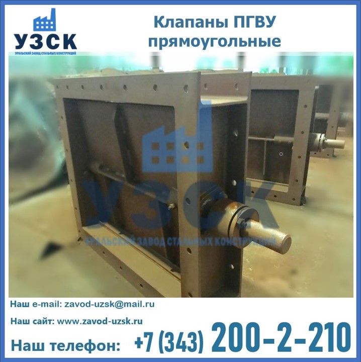 Прямоугольный клапан ПГВУ имеет прямоугольную или квадратную форму, по основному сечению конструкции, на которую устанавливается клапан. Для изготовления шиберов ПГВУ в Королёве применяются сталь нержавеющая, углеродистая или низколегированная, в зависимости от модели. Внутри клапана имеется запорный элемент, передвигающийся параллельно общему потоку движения среды. Запорный элемент, или створка имеет такую же форму, как и основное сечение. Перемещение створки происходит благодаря возвратно-поступательным движениям.