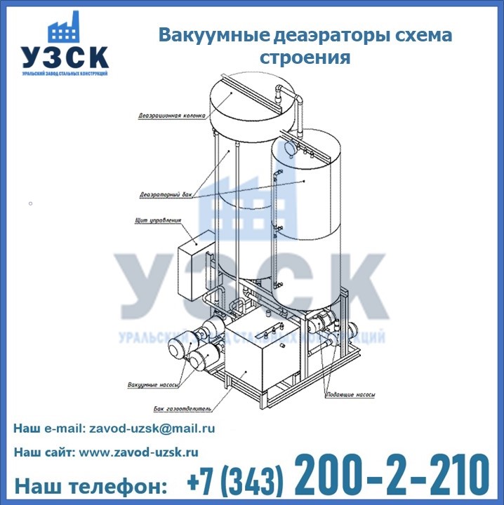 Вакуумный деаэратор в базовой комплектации состоит из колонки ДВ, охладителя выпара ОВВ, эжектора водоструйного ЭВ. Конструкция ДВ включает в себя гидроаккумуляторную емкость, предназначенную для отстоя воды из технологических линий (цилиндр с 2 емкостными отделами, между которыми установлен средоразделитель), вакуумную емкость для создания разряженного давления и проведения очистки, колонку для создания вакуума, технологическую арматуру и задвижки, рециркуляционные насосы и нагнетатель, пароконденсаторы для конденсации пара и его превращения в воду, блок уравнивания давлением.